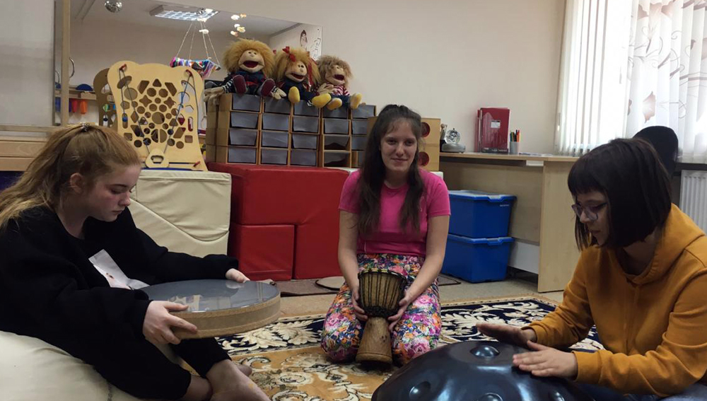 Педагог — психолог ГБОУ ЦРО 7 Арина Александровна Миллер проводит с воспитанниками занятия музыкально — ритмической терапией.