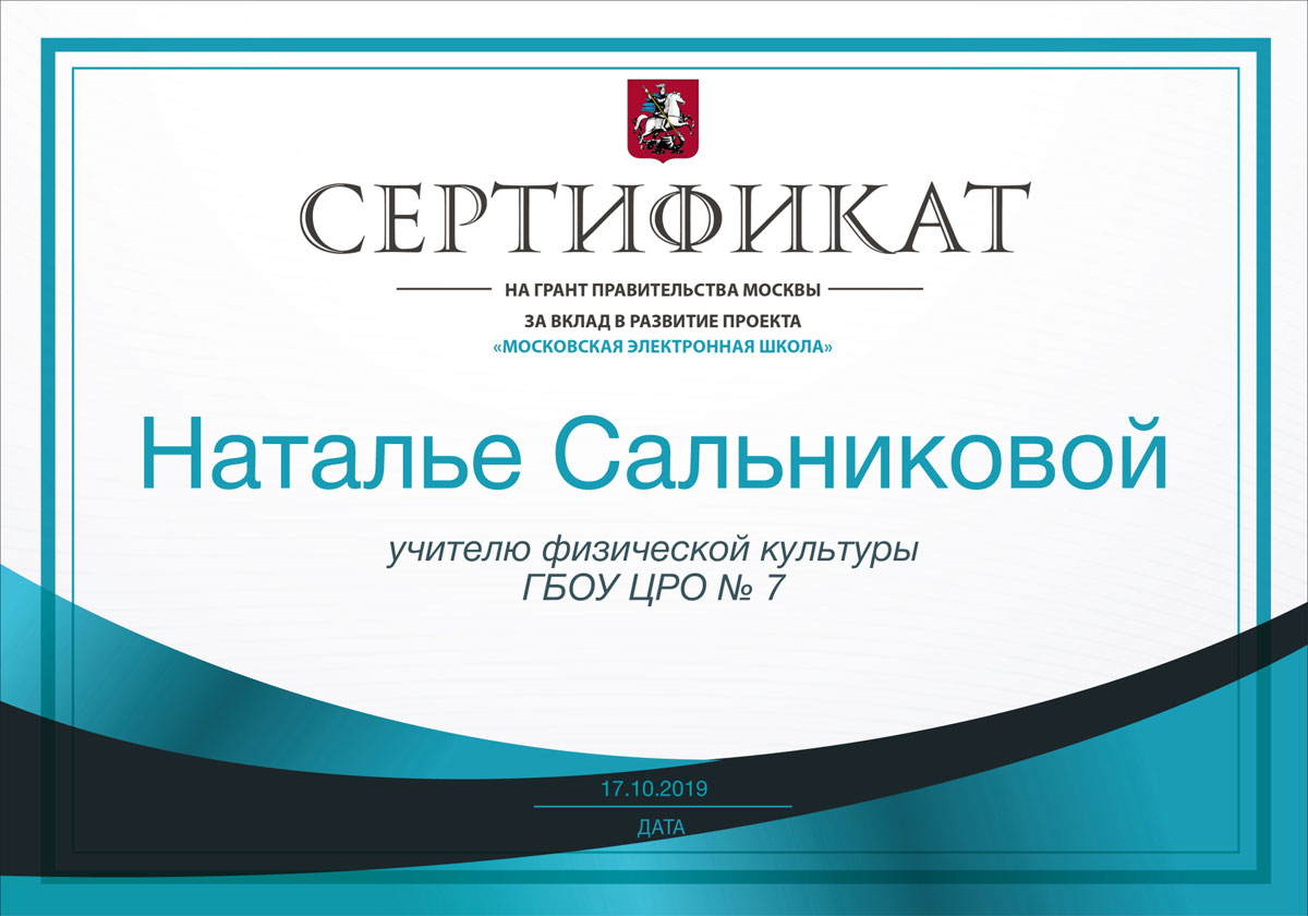 Грант правительства Москвы за вклад в развитие проекта «Московская электронная школа» получила учитель физической культуры Сальникова Наталья Валентиновна.