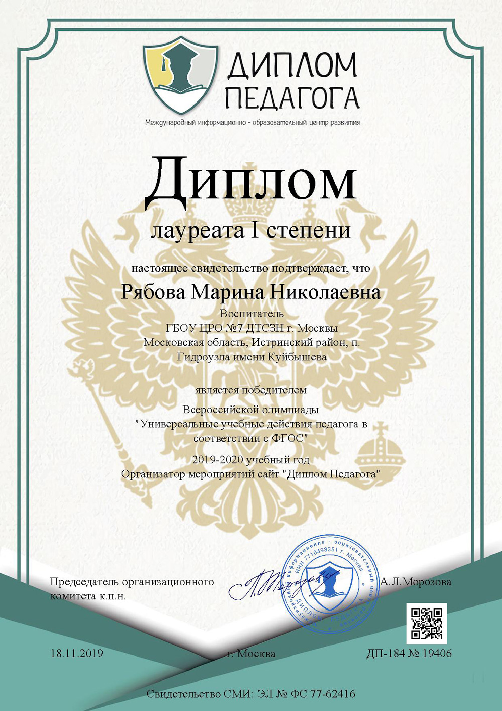 Поздравляем воспитателя ГБОУ ЦРО №7 Рябову Марину Николаевну с победами в профессиональных конкурсах.