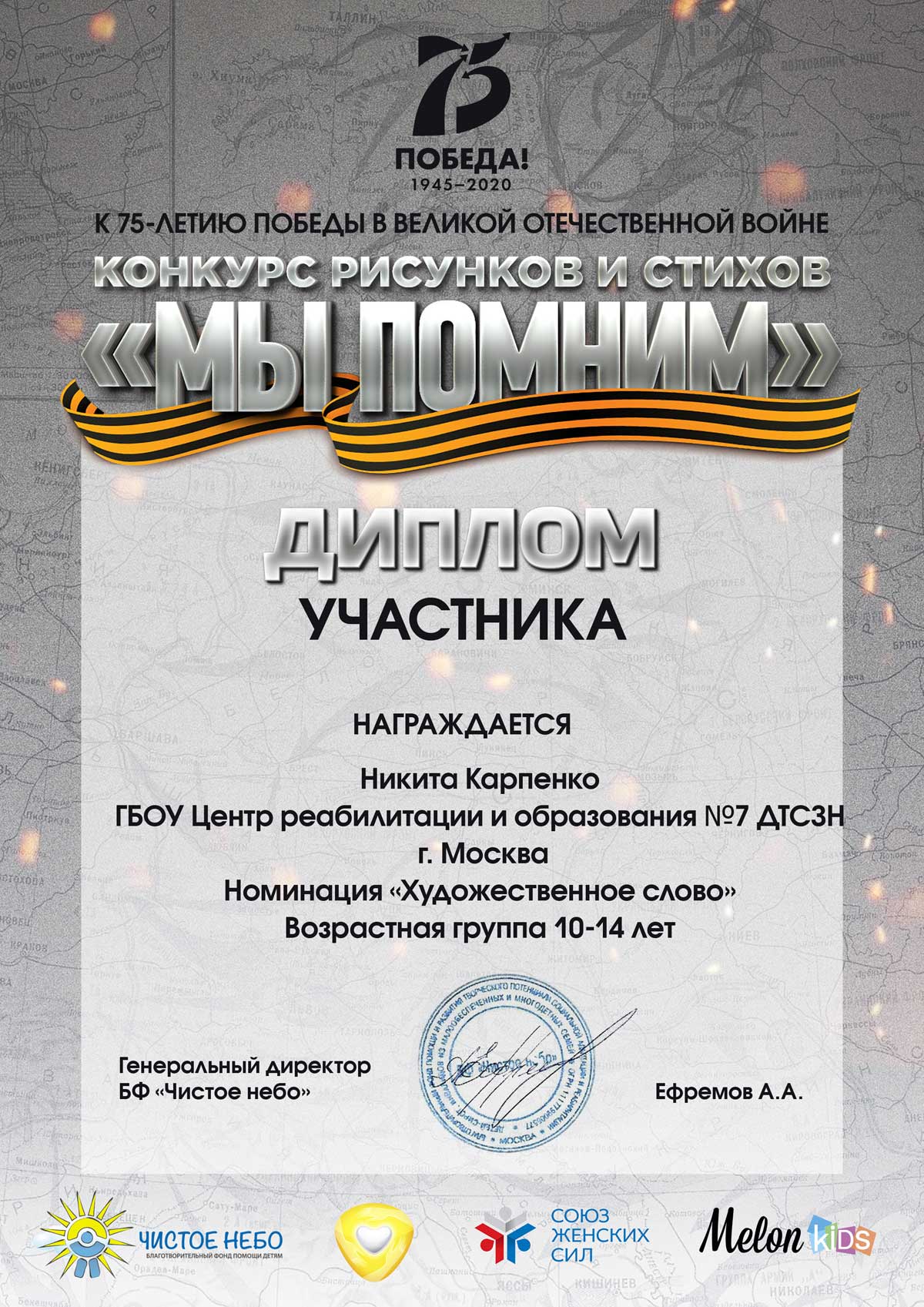 Воспитанник ГБОУ ЦРО №7 Карпенко Никита принял участие в онлайн – конкурсе, организованном Благотворительным фондом «Чистое небо» Министерства социального развития Московской области в номинации «Художественное слово».