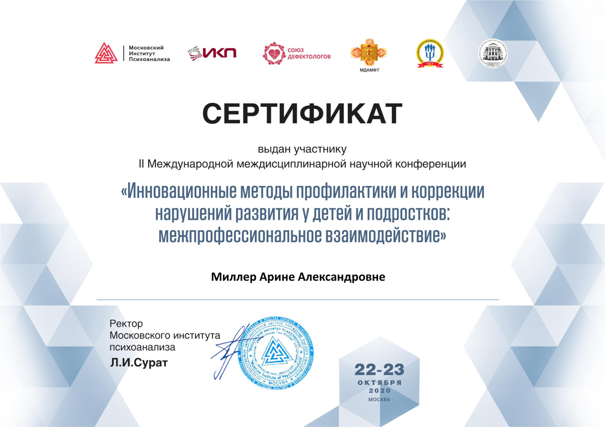 Участие педагога-психолога ГБОУ ЦРО № 7 Миллер Арины Александровны во II Международной междисциплинарной научной конференции «Инновационные методы профилактики и коррекции нарушений развития у детей и подростков: межпрофессиональное взаимодействие»