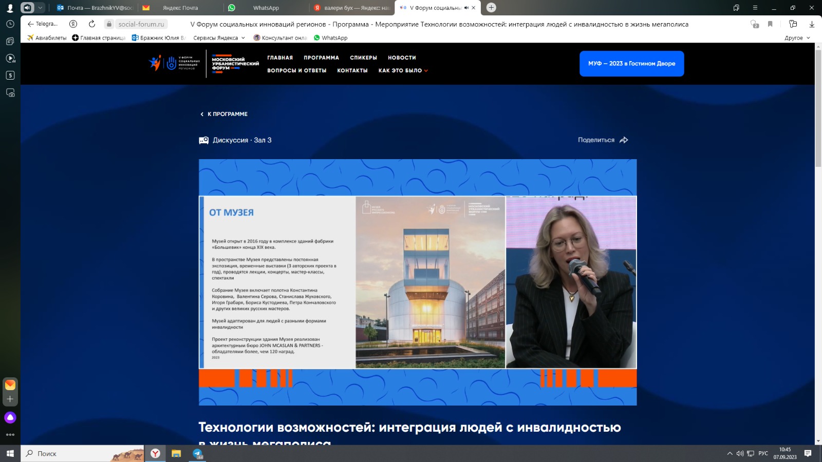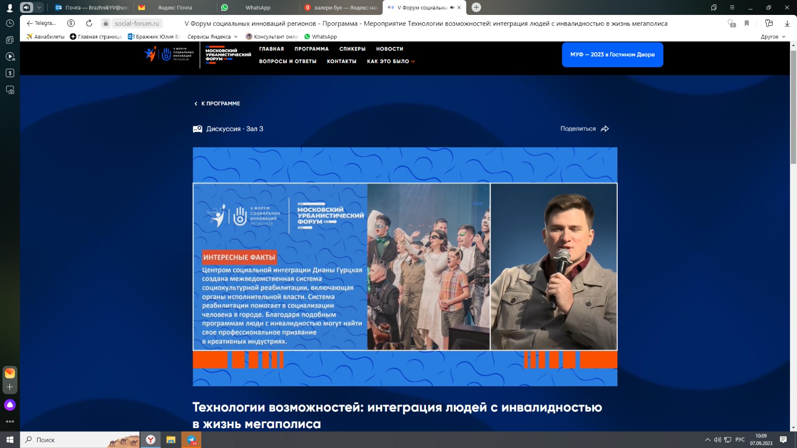 Сегодня на площадке Московского урбанистического форума прошла дискуссия «Технологии возможностей: интеграция людей с инвалидностью в жизнь мегаполиса», модератором которой выступил А. А. Володин — заместитель руководителя Департамента труда и социальной защиты населения города Москвы.