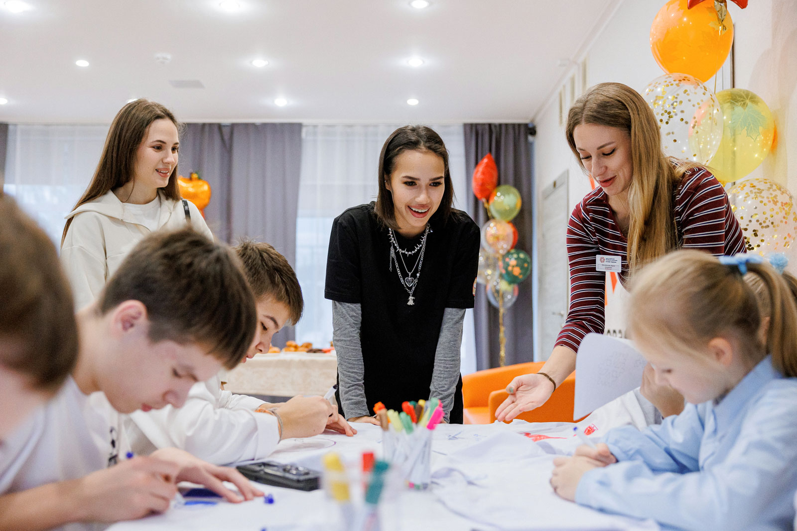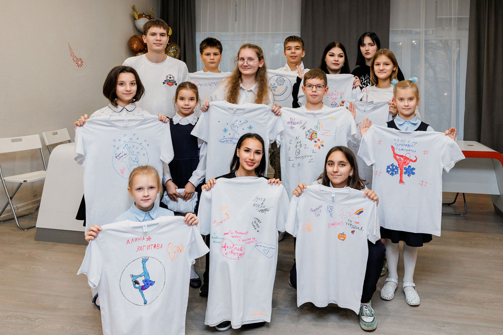 Фигуристка приехала в гости к Василисе из центра для детей-сирот. Ко встрече присоединились и другие ребята. Вместе со спортсменкой они изготовили футболки с индивидуальным дизайном, станцевали и душевно пообщались.