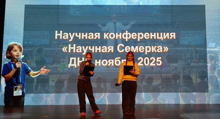 Вчера состоялась научная конференция «ДНК Семерка», которая стала кульминацией заседаний Детского научного клуба. Ребята со сцены презентовали отчёт о проделанной работе.