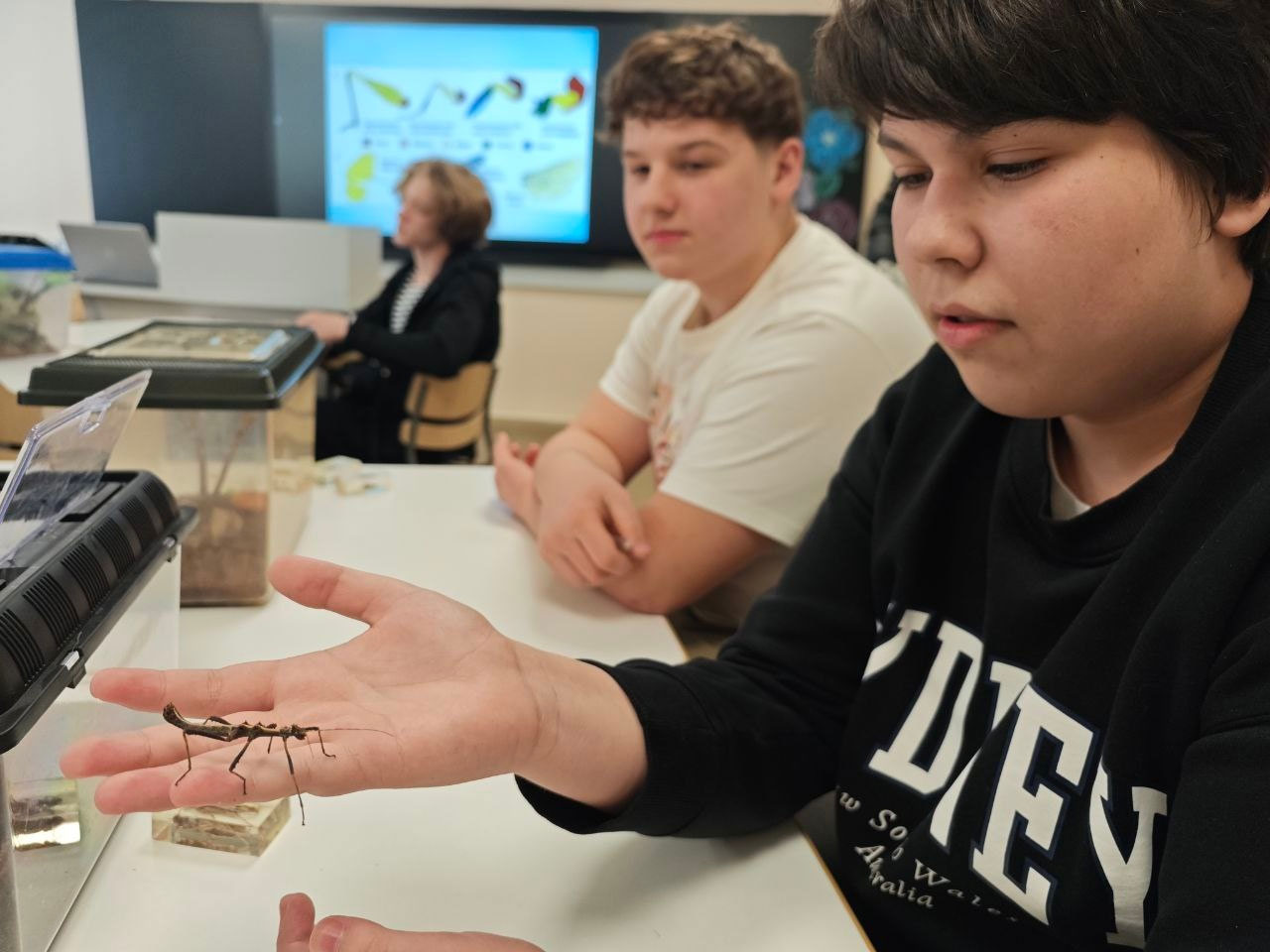 Большой популярностью у ребят в нашем центре пользуется инсектарий. Здесь настоящее царство насекомых. Дети наблюдают за фазами их жизненного цикла, особенностями поведения и питания, под микроскопом изучают строение глаза бабочки или лапки палочника.
